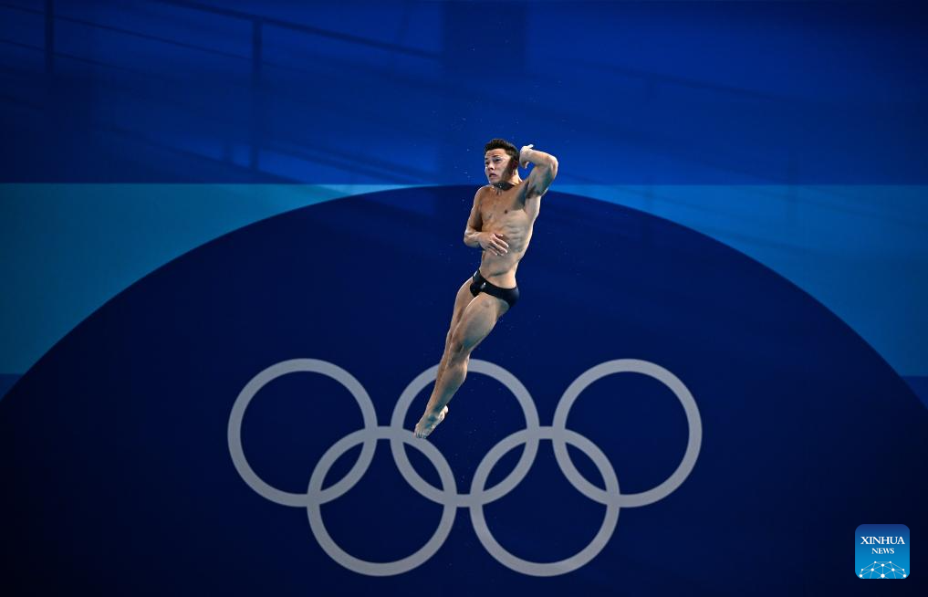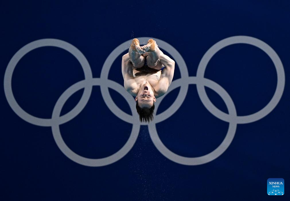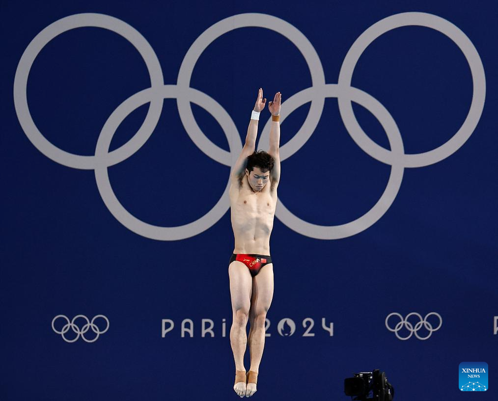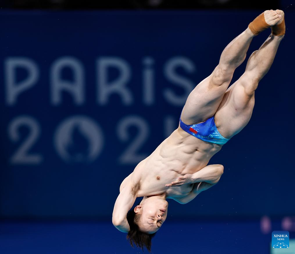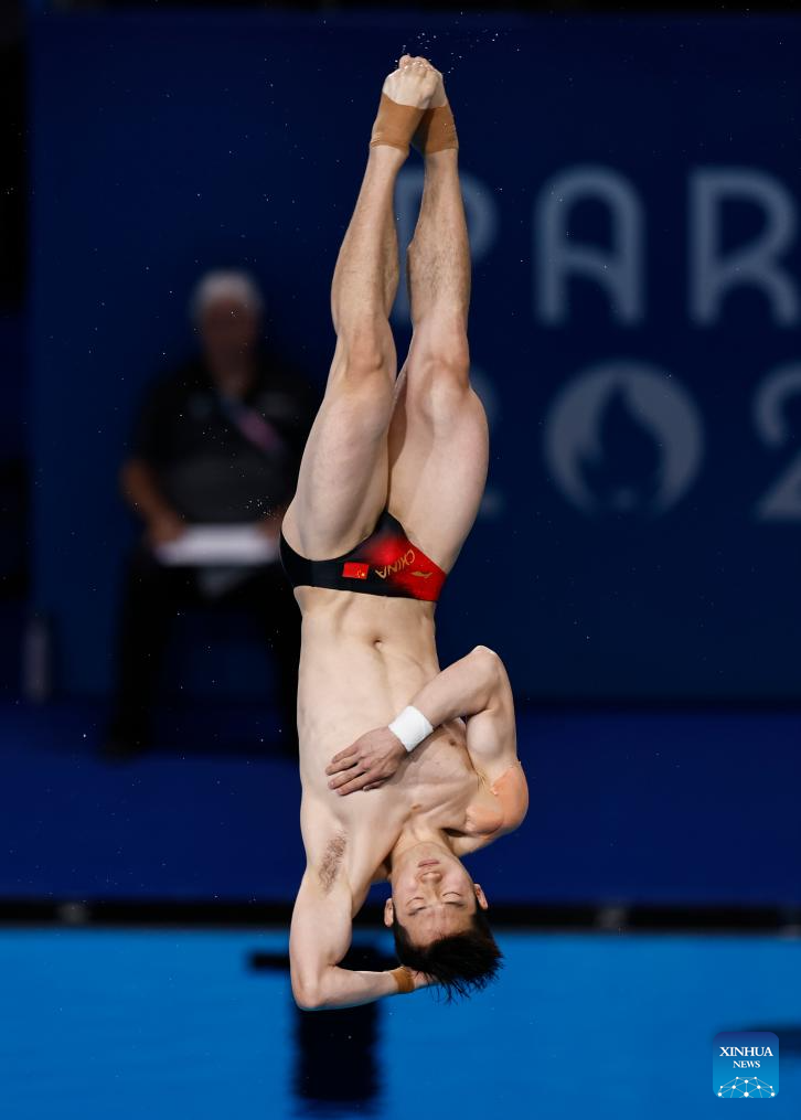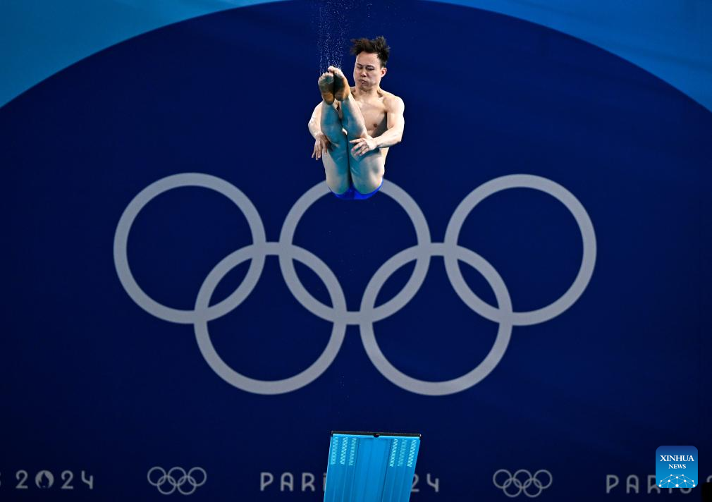 Xie Siyi of China competes during the men's 3m springboard semifinal of diving at the Paris 2024 Olympic Games in Saint-Denis, France, Aug. 7, 2024. (Xinhua/Wang Peng)