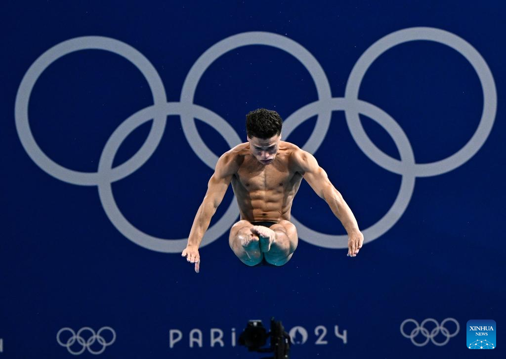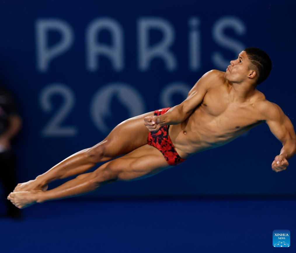 Luis Felipe Uribe Bermudez of Colombia competes during the men's 3m springboard semifinal of diving at the Paris 2024 Olympic Games in Saint-Denis, France, Aug. 7, 2024. (Xinhua/Zhang Yuwei)