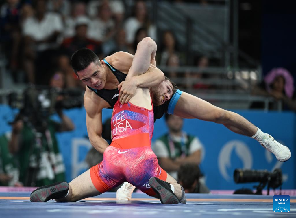 Zou Wanhao (in blue) of China competes against Spencer Richard Lee of the United States during the men's freestyle 57kg 1/8 final of wrestling at the Paris 2024 Olympic Games in Paris, France, Aug. 8, 2024. (Xinhua/Wu Wei)