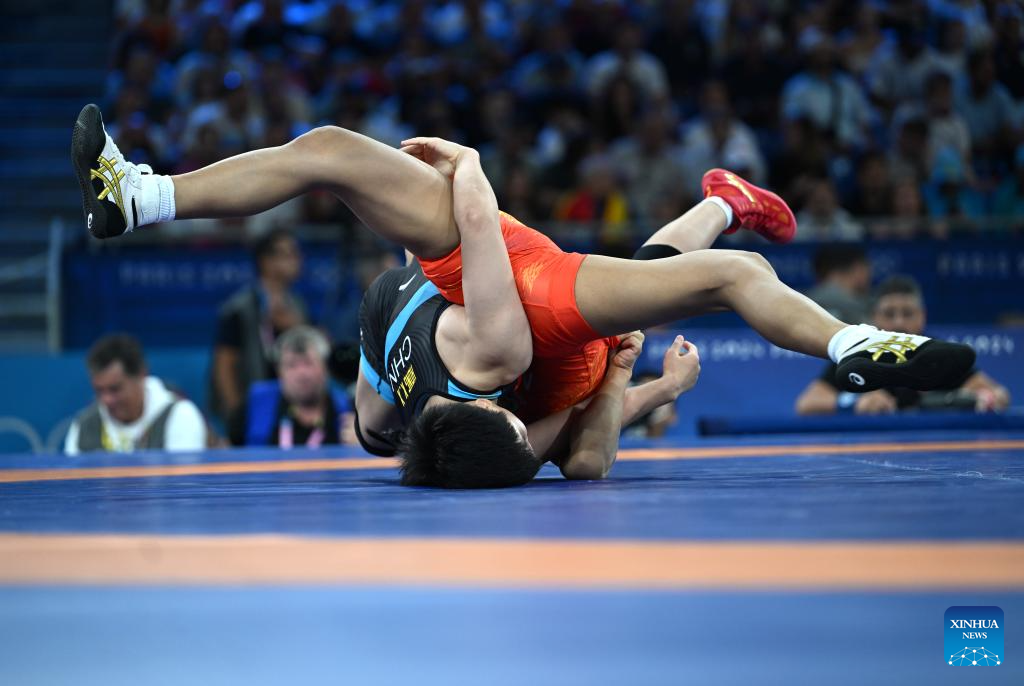 Hong Kexin (bottom) of China competes against Khongorzul Boldsaikhan of Mongolia during the women's freestyle 57kg 1/8 final of wrestling at the Paris 2024 Olympic Games in Paris, France, Aug. 8, 2024.. (Xinhua/Wu Wei)