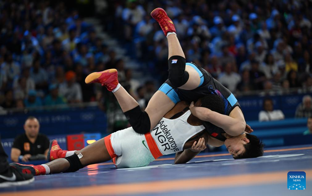 Hong Kexin (in blue) of China competes against Odunayo Folasade Adekuoroye of Nigeria during the women's freestyle 57kg 1/4 final of wrestling at the Paris 2024 Olympic Games in Paris, France, Aug. 8, 2024. (Xinhua/Wu Wei)