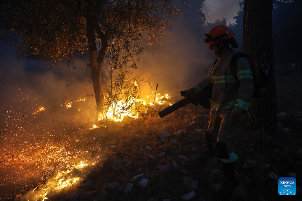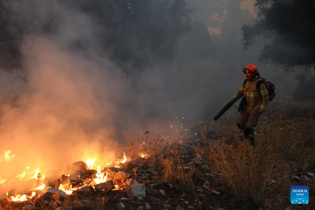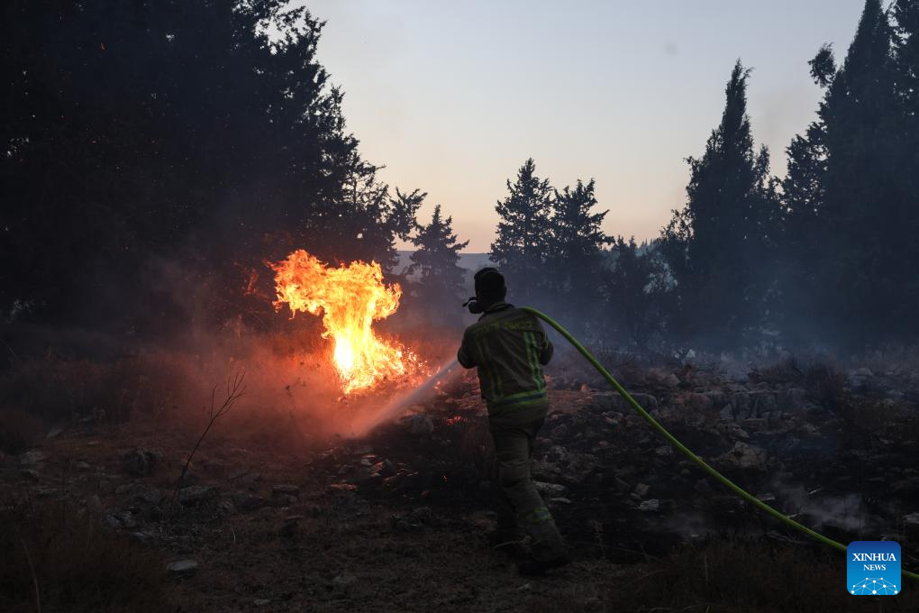An Israeli firefighter works to extinguish wildfires caused by attacks from Lebanon, near Safed, northern Israel, on Aug. 7, 2024. The Hezbollah Military Media announced on Wednesday that the Islamic Resistance attacked several Israeli sites and gatherings. (David Cohen/JINI via Xinhua)