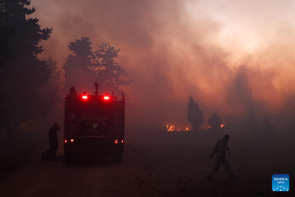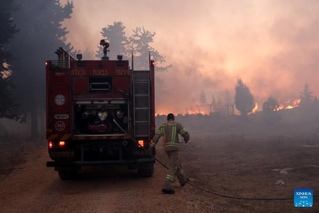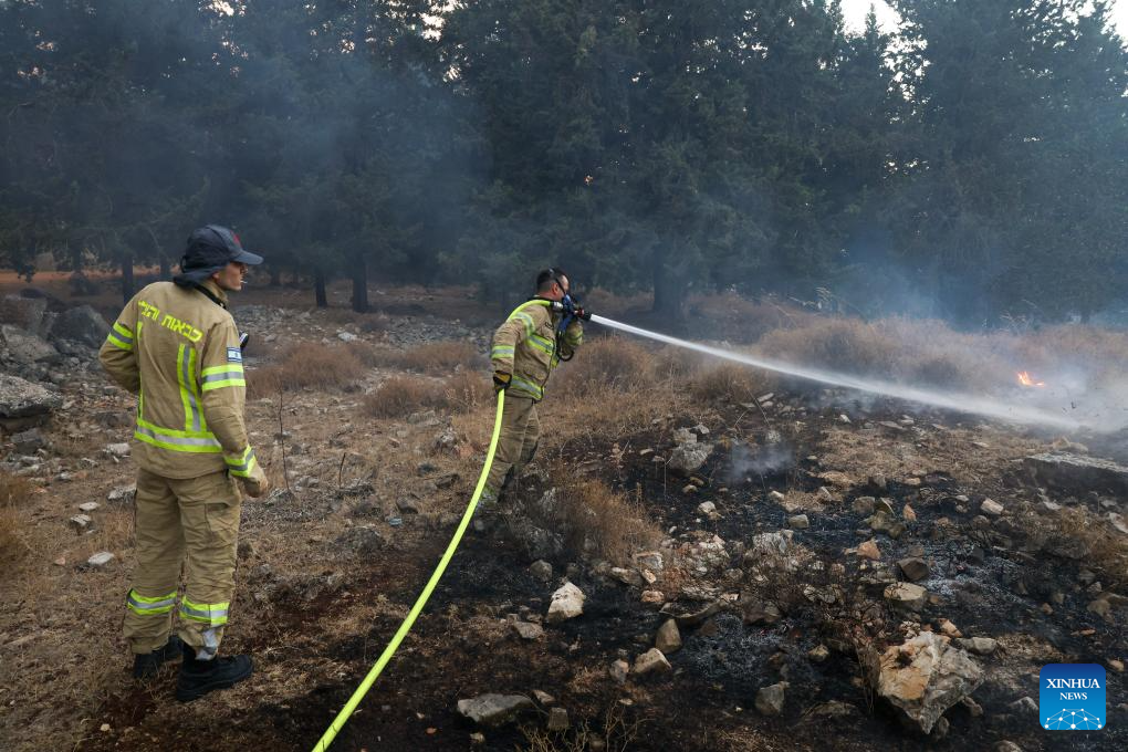 Israeli firefighters work to extinguish wildfires caused by attacks from Lebanon, near Safed, northern Israel, on Aug. 7, 2024. The Hezbollah Military Media announced on Wednesday that the Islamic Resistance attacked several Israeli sites and gatherings. (David Cohen/JINI via Xinhua)