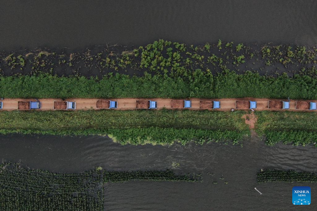 This aerial drone photo taken on Aug. 7, 2024 shows emergency workers transporting building materials to reinforce a newly repaired dike in Tieling, northeast China's Liaoning Province.