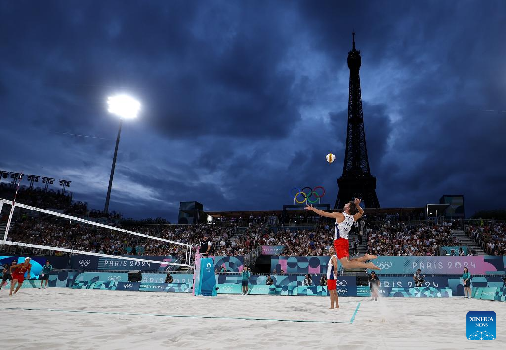 Anders Berntsen Mol of Norway serves during the men's beach volleyball quarterfinal between Pablo Herrera Allepuz/Adrian Gavira Collado of Spain and Anders Berntsen Mol/Christian Sandlie Soerum of Norway at the Paris 2024 Olympic Games in Paris, France, Aug. 7, 2024. (Xinhua/Cao Can)