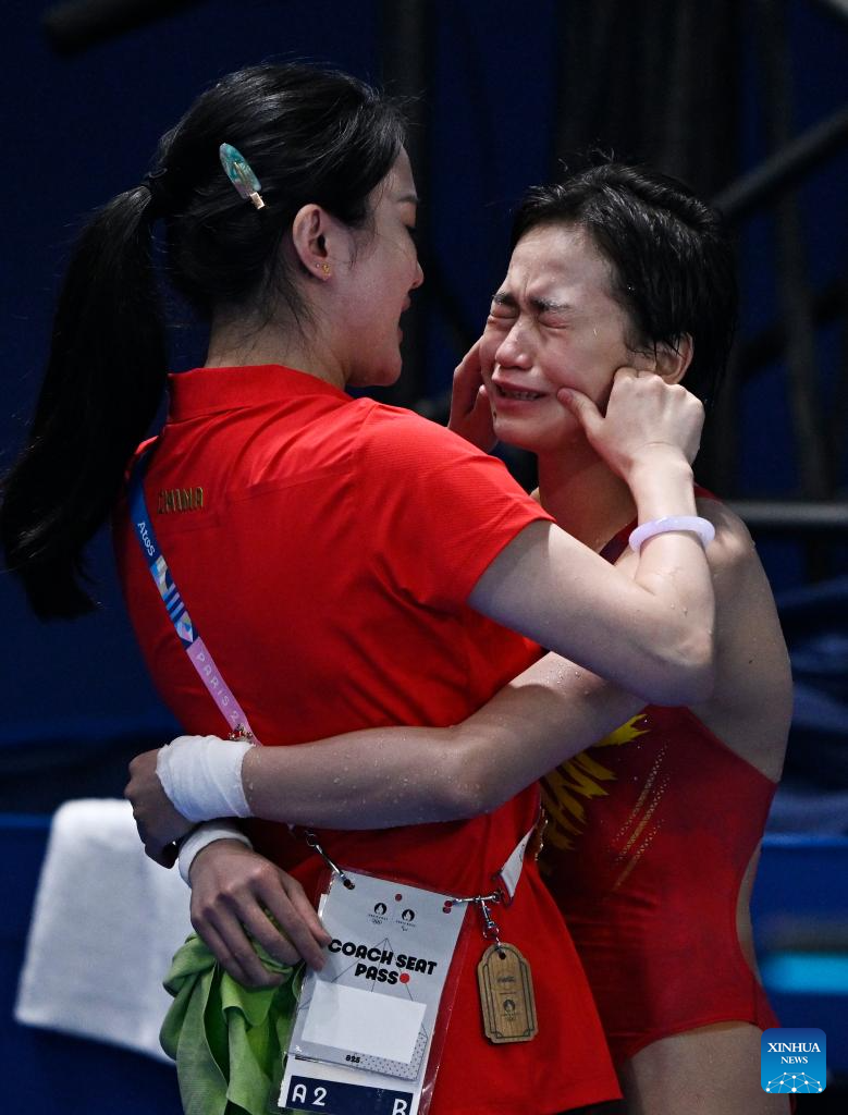 Quan Hongchan (R) of China reacts after the women's 10m platform final of diving at the Paris 2024 Olympic Games in Saint-Denis, France, Aug. 6, 2024. (Xinhua/Wang Peng)