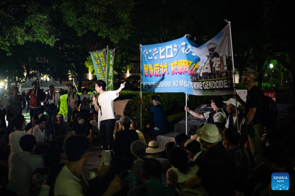 As Japan marked the anniversary of atomic bombing on the western city of Hiroshima on Tuesday, people from across the nation gathered to protest the government's accelerated arms build-up, urging it to stick to peace. (Xinhua/Zhang Xiaoyu)