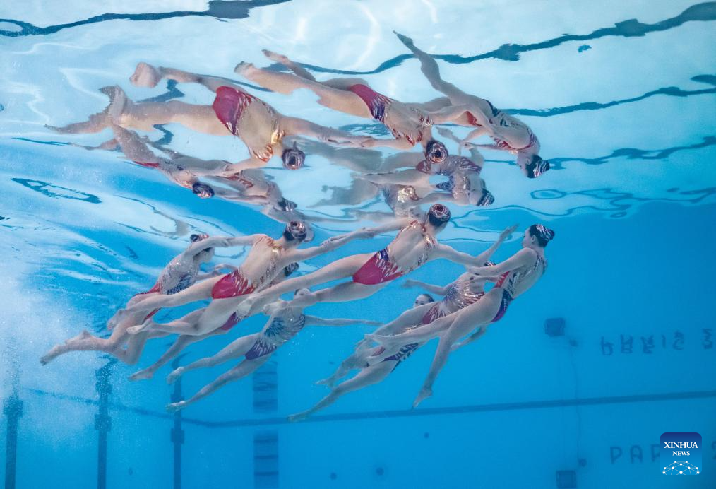 Team China compete during the team acrobatic routine of artistic swimming at the Paris 2024 Olympic Games in Saint-Denis, France, Aug. 7, 2024. (Xinhua/Xia Yifang)