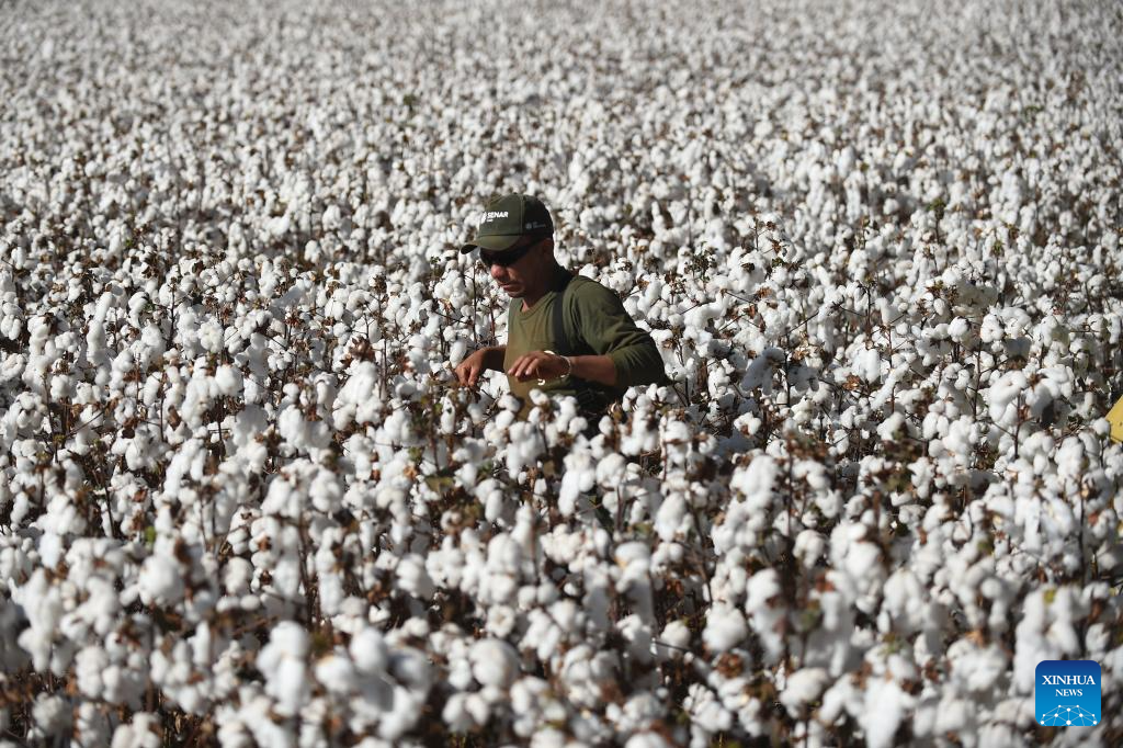 A man walks in a cotton field at a farm in Cristalina, Goias, Brazil, Aug. 6, 2024. (Photo by Lucio Tavora/Xinhua)