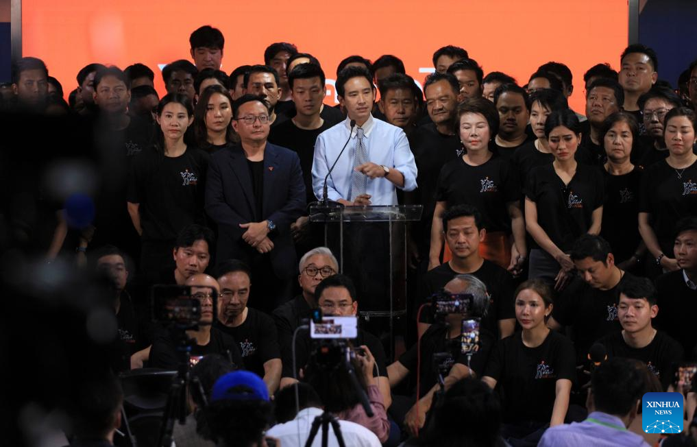 Pita Limjaroenrat (C), former leader of Thailand's Move Forward Party, attends a press conference at the headquarters of the party in Bangkok, Thailand, Aug. 7, 2024. Thailand's Constitutional Court on Wednesday dissolved the main opposition Move Forward Party, ruling its efforts to amend a law against defaming the kingdom's royal family violated the constitution. (Xinhua/Rachen Sageamsak)