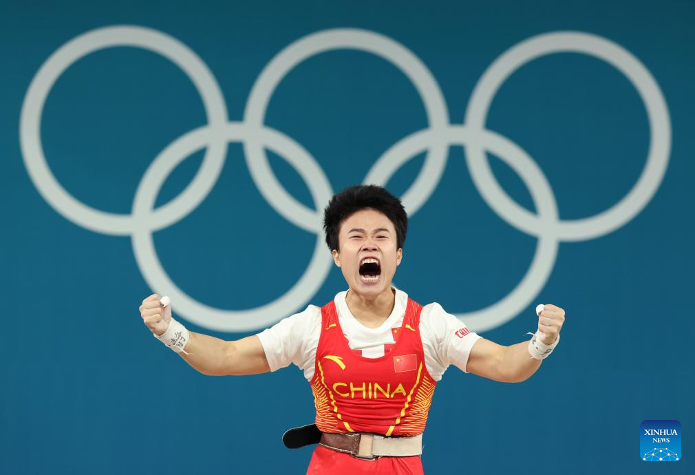 Hou Zhihui of China celebrates after winning the women's 49kg of weightlifting at the Paris 2024 Olympic Games in Paris, France, Aug. 7, 2024. (Xinhua/Yang Lei)
