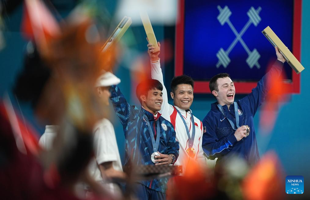 Gold medalist Li Fabin (C) of China, silver medalist Theerapong Silachai (L) of Thailand and bronze medalist Hampton Morris of the United States pose for photos during the victory ceremony of weightlifting men's 61kg at the Paris 2024 Olympic Games in Paris, France, on Aug. 7, 2024. (Xinhua/Fei Maohua)