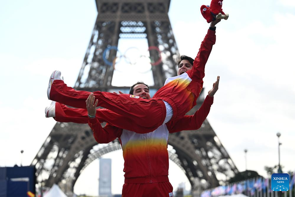 Alvaro Martin (back) and Maria Perez of Spain celebrate after the marathon race walk relay mixed of Athletics at the Paris 2024 Olympic Games in Paris, France, Aug. 7, 2024. (Xinhua/Song Yanhua)