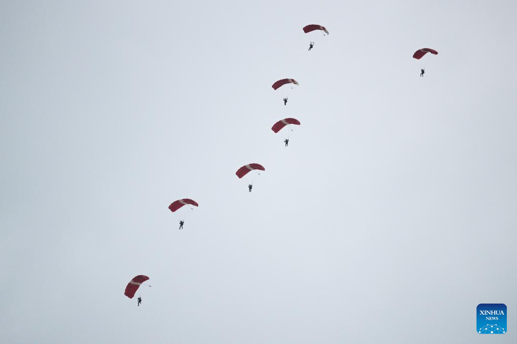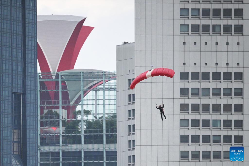 Skydivers of "Red Lions" team perform during the National Day Parade at Padang near the Marina Bay in Singapore on Aug. 9, 2024. Singapore held a parade on Friday to celebrate the 59th anniversary of independence and the 40th anniversary of the "Total Defense" policy at Padang, an open field near the iconic Marina Bay. (Photo by Then Chih Wey/Xinhua)