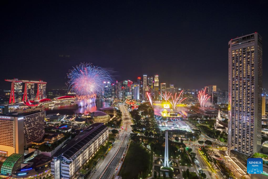Fireworks light up the sky during the National Day Parade at Padang near the Marina Bay in Singapore on Aug. 9, 2024. Singapore held a parade on Friday to celebrate the 59th anniversary of independence and the 40th anniversary of the "Total Defense" policy at Padang, an open field near the iconic Marina Bay. (Photo by Then Chih Wey/Xinhua)