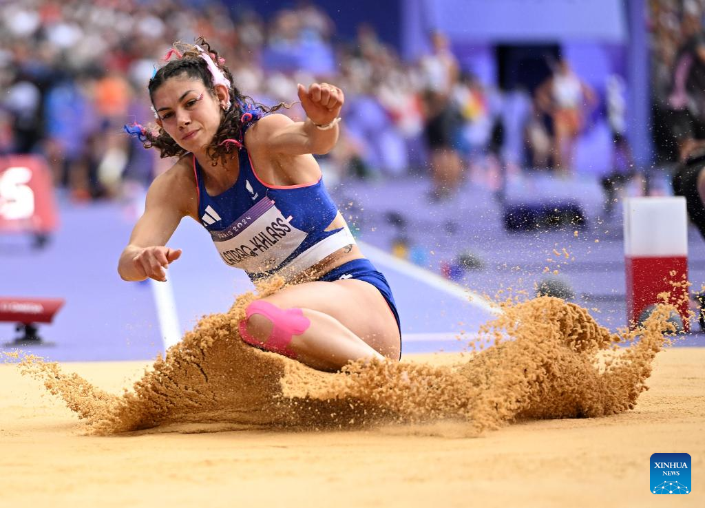 Auriana Lazraq-Khlass of France competes during the women's heptathlon long jump of Athletics at the Paris 2024 Olympic Games in Paris, France, Aug. 9, 2024. (Xinhua/Song Yanhua)
