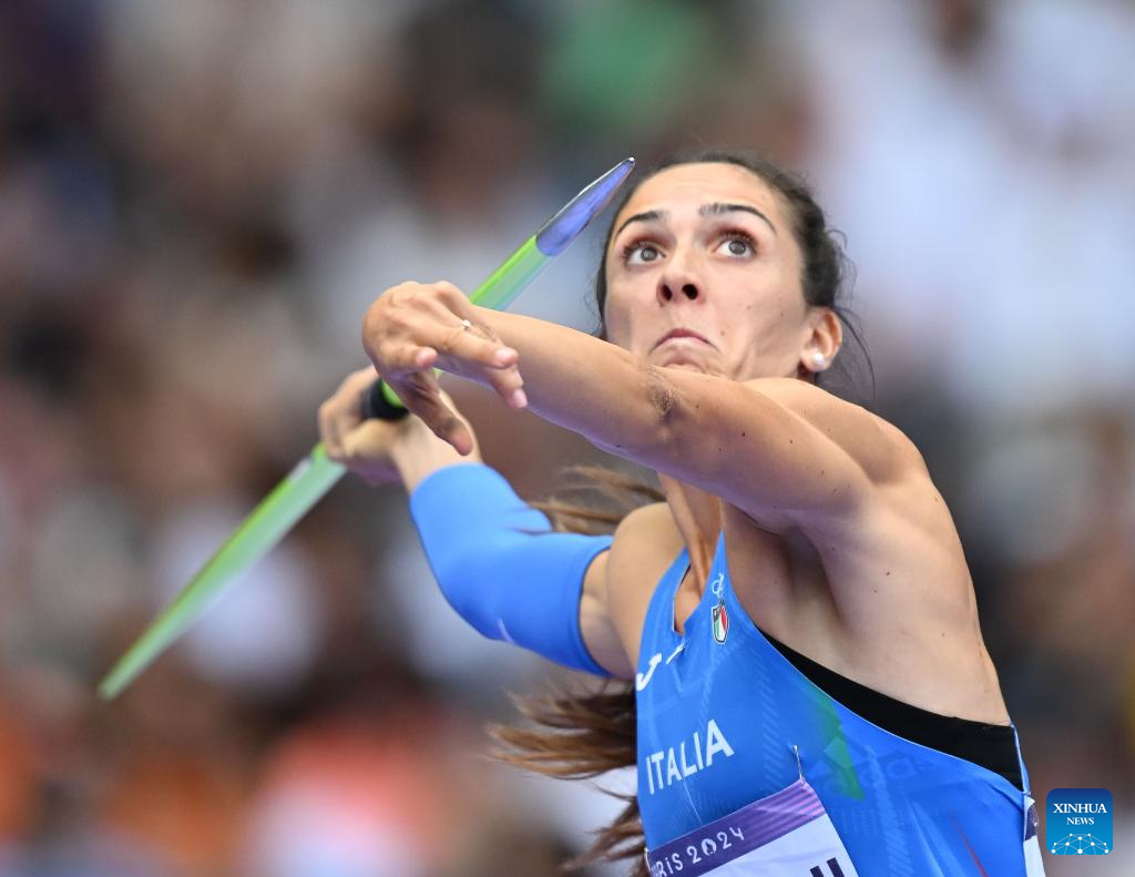 Sveva Gerevini of Italy competes during the women's heptathlon javelin throw of Athletics at the Paris 2024 Olympic Games in Paris, France, Aug. 9, 2024. (Xinhua/Song Yanhua)