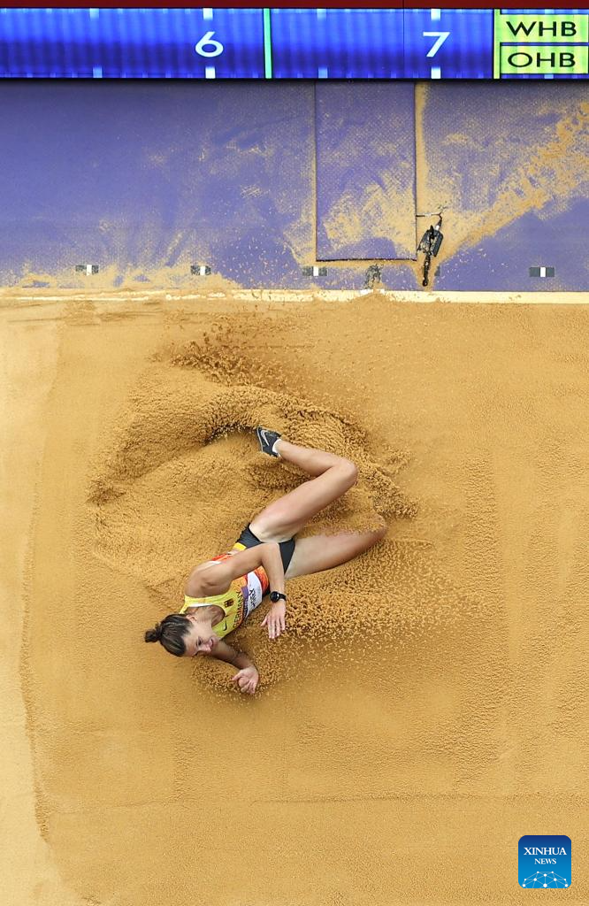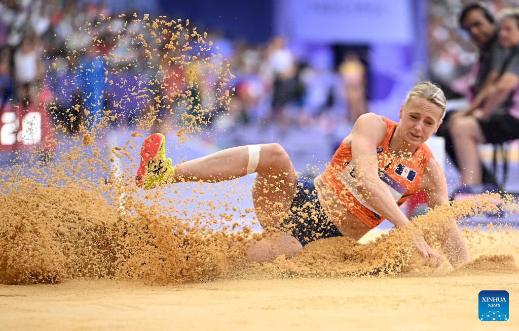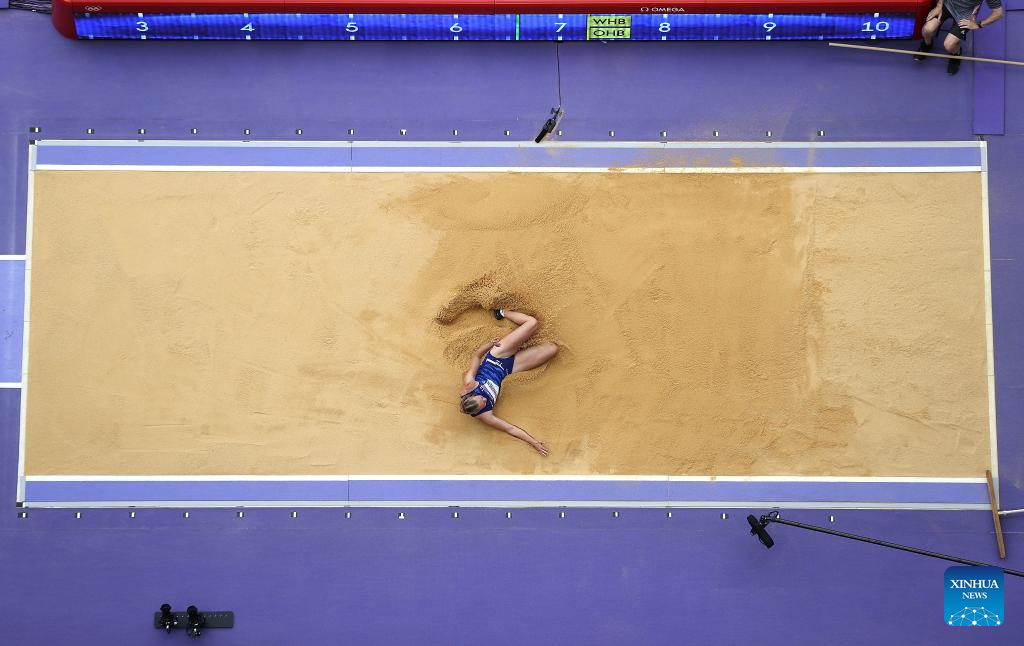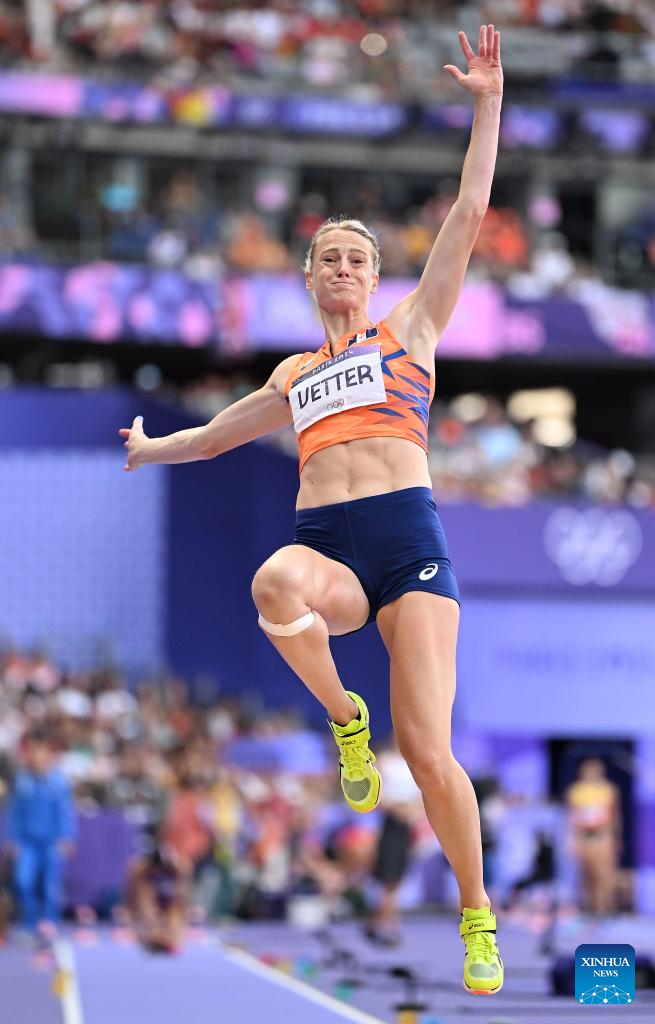 Anouk Vetter of the Netherlands competes during the women's heptathlon long jump of Athletics at the Paris 2024 Olympic Games in Paris, France, Aug. 9, 2024. (Xinhua/Song Yanhua)