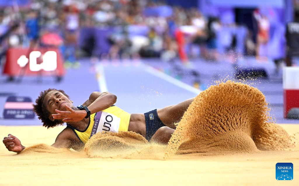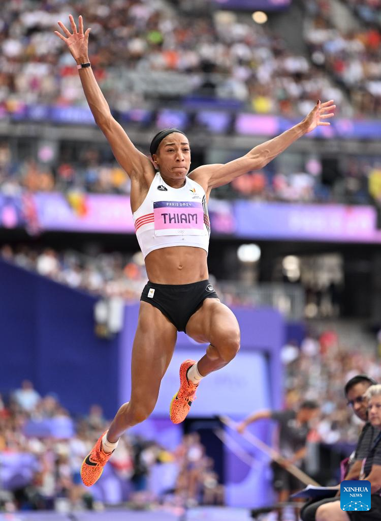 Nafissatou Thiam of Belgium competes during the women's heptathlon long jump of Athletics at the Paris 2024 Olympic Games in Paris, France, Aug. 9, 2024. (Xinhua/Song Yanhua)