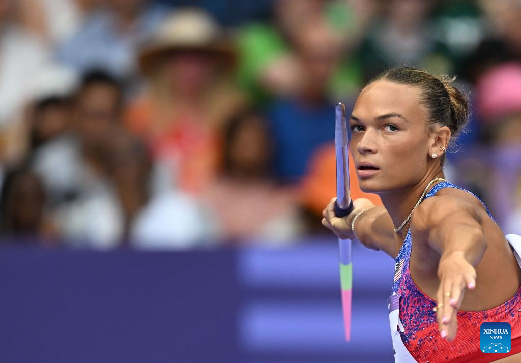 Anna Hall of the United States competes during the women's heptathlon javelin throw of Athletics at the Paris 2024 Olympic Games in Paris, France, Aug. 9, 2024. (Xinhua/Song Yanhua)
