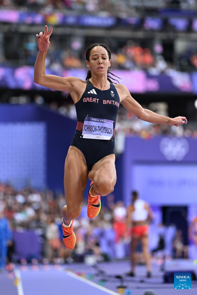 Katarina Johnson-Thompson of Britain competes during the women's heptathlon long jump of Athletics at the Paris 2024 Olympic Games in Paris, France, Aug. 9, 2024. (Xinhua/Song Yanhua)