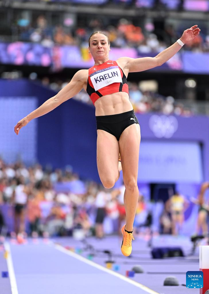 Annik Kaelin of Switzerland competes during the women's heptathlon long jump of Athletics at the Paris 2024 Olympic Games in Paris, France, Aug. 9, 2024. (Xinhua/Song Yanhua)