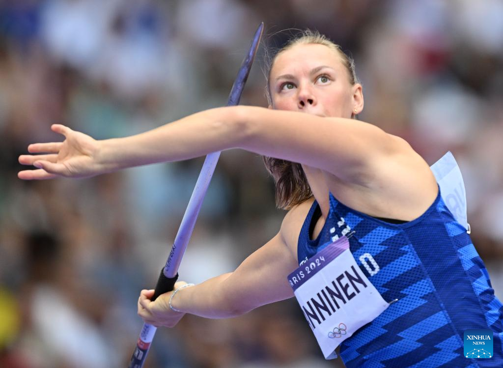 Saga Vanninen of Finland competes during the women's heptathlon javelin throw of Athletics at the Paris 2024 Olympic Games in Paris, France, Aug. 9, 2024. (Xinhua/Song Yanhua)