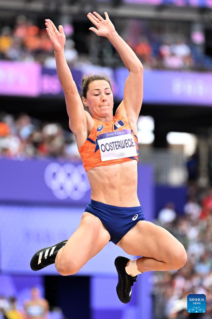 Emma Oosterwegel of the Netherlands competes during the women's heptathlon long jump of Athletics at the Paris 2024 Olympic Games in Paris, France, Aug. 9, 2024. (Xinhua/Song Yanhua)