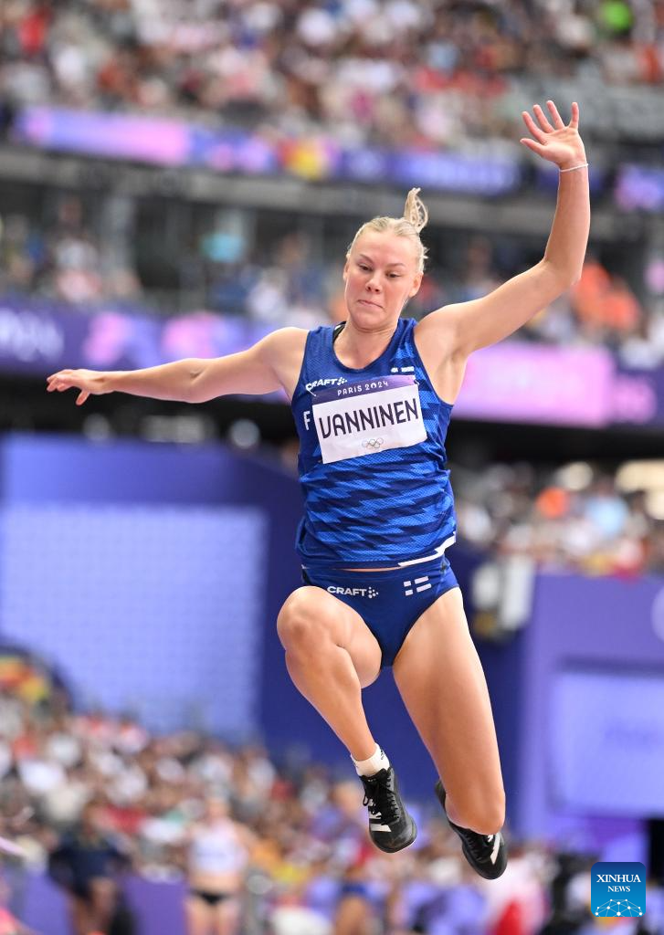 Saga Vanninen of Finland competes during the women's heptathlon long jump of Athletics at the Paris 2024 Olympic Games in Paris, France, Aug. 9, 2024. (Xinhua/Song Yanhua)
