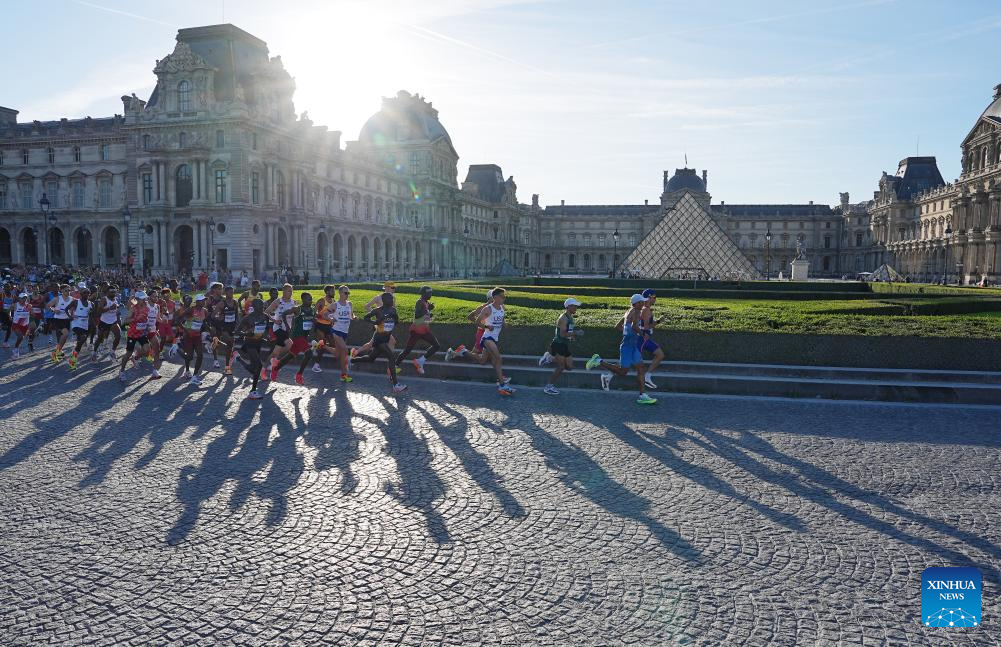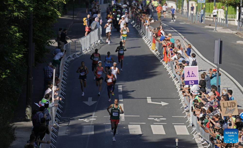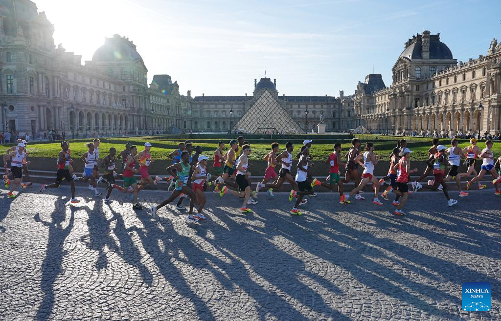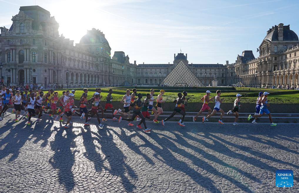Athletes compete during the men's marathon of athletics at the Paris 2024 Olympic Games in Paris, France, Aug. 10, 2024. (Xinhua/Li Ming)