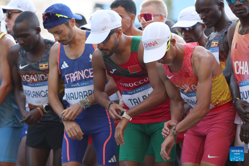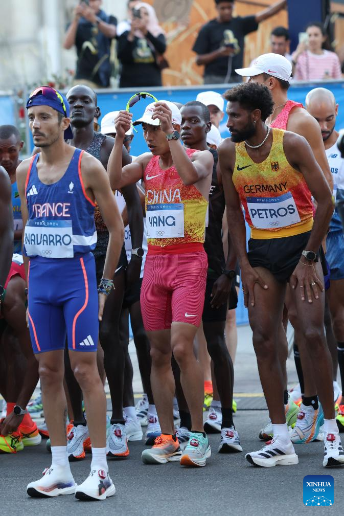 Yang Shaohui (C) of China is seen prior to the men's marathon of athletics at the Paris 2024 Olympic Games in Paris, France, Aug. 10, 2024. (Xinhua/Li Ming)