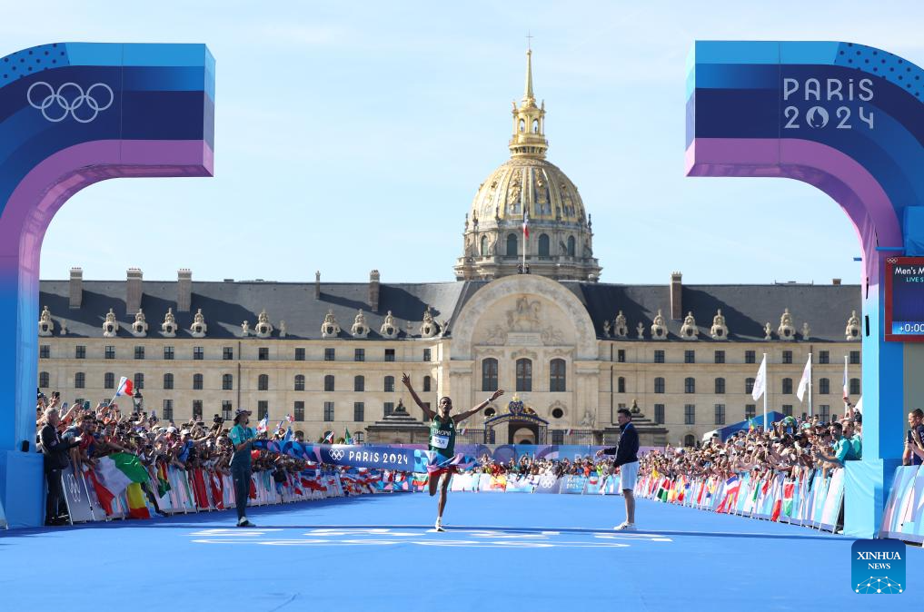 Tamirat Tola of Ethiopia passes the finish line during the men's marathon of athletics at the Paris 2024 Olympic Games in Paris, France, Aug. 10, 2024. (Xinhua/Li Ying)