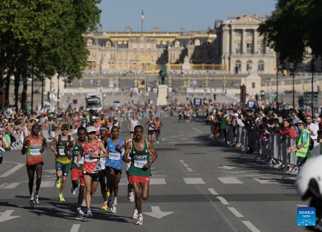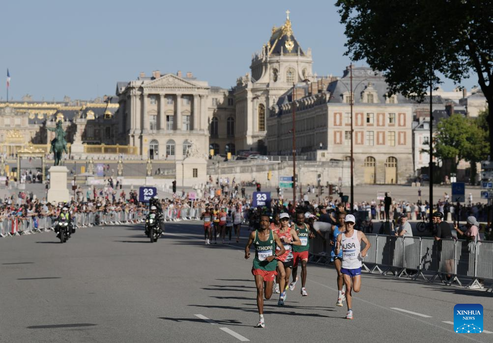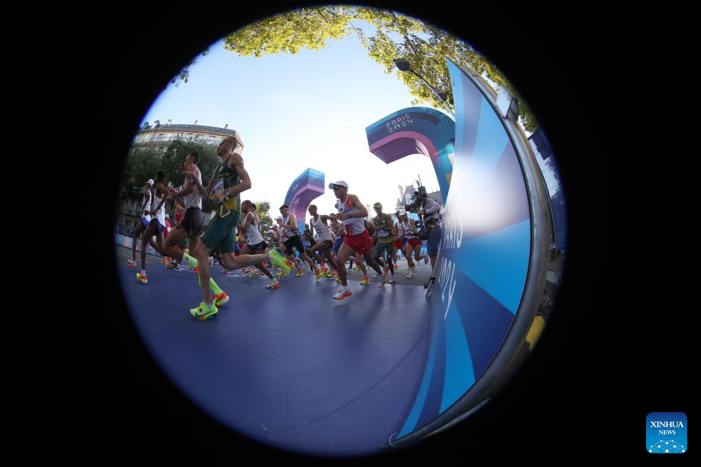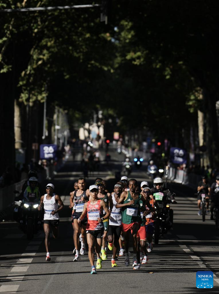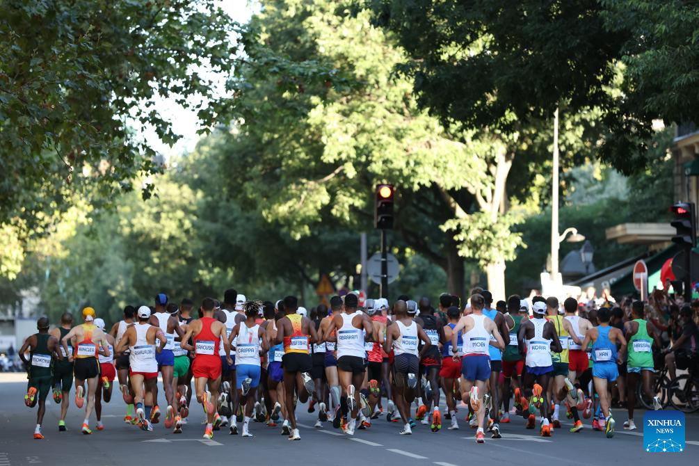 Athletes compete during the men's marathon of athletics at the Paris 2024 Olympic Games in Paris, France, Aug. 10, 2024. (Xinhua/Li Gang)