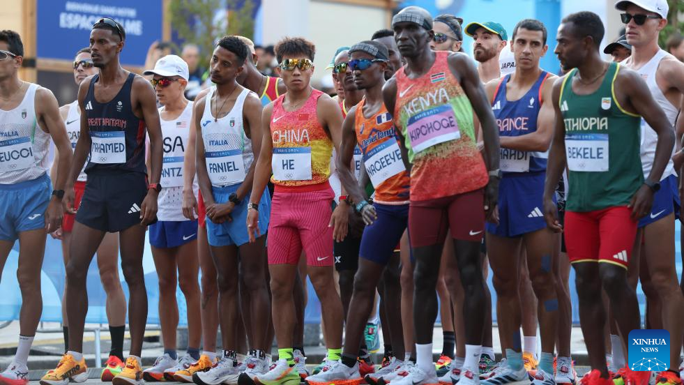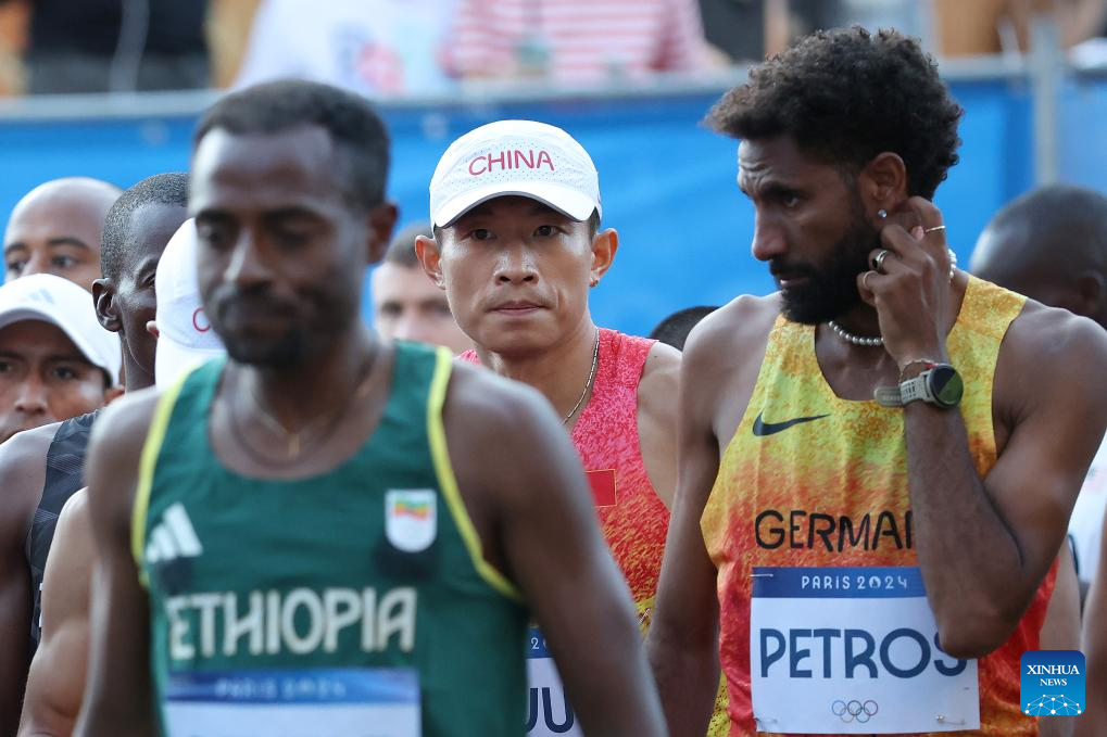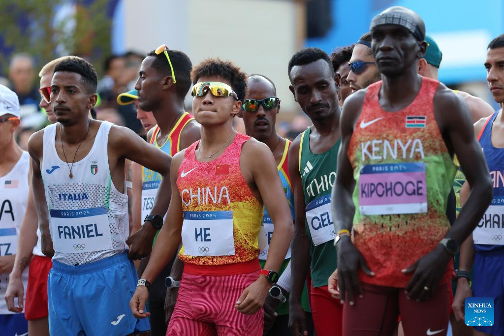 He Jie (C) of China reacts before the men's marathon of athletics at the Paris 2024 Olympic Games in Paris, France, Aug. 10, 2024. (Xinhua/Li Ming)
