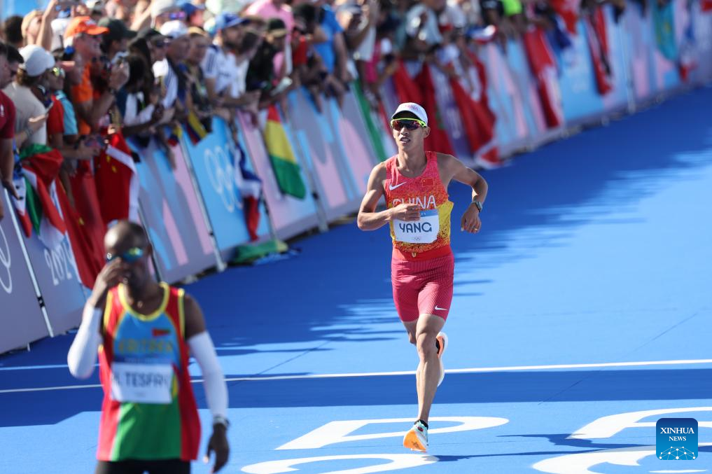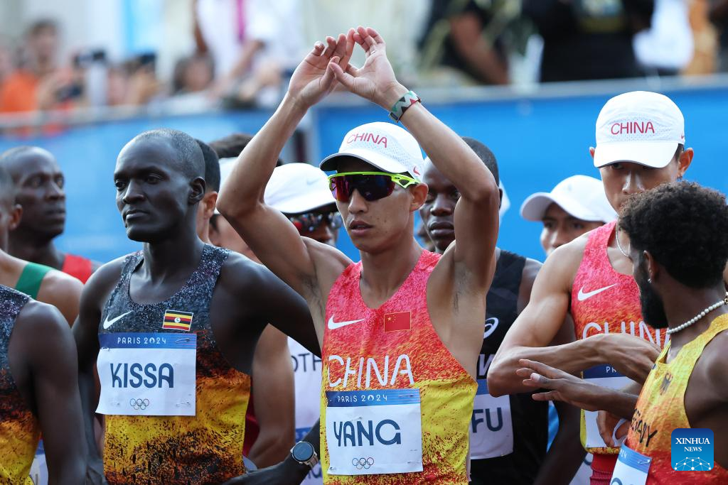 Yang Shaohui of China reacts after passing the finish line during the men's marathon of athletics at the Paris 2024 Olympic Games in Paris, France, Aug. 10, 2024. (Xinhua/Li Gang)