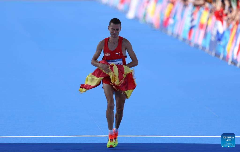 Dario Ivanovski of North Macedonia arrives at the finish line during the men's marathon of Athletics at the Paris 2024 Olympic Games in Paris, France, Aug. 10, 2024. (Xinhua/Li Jing)