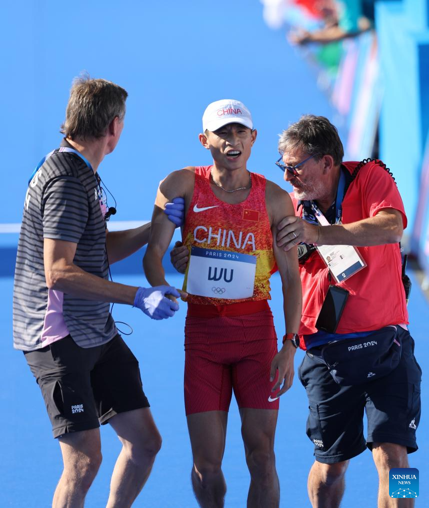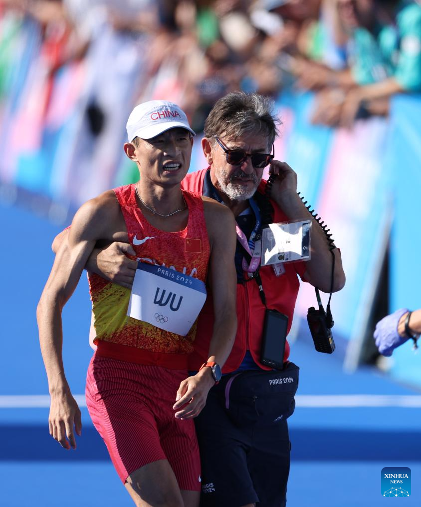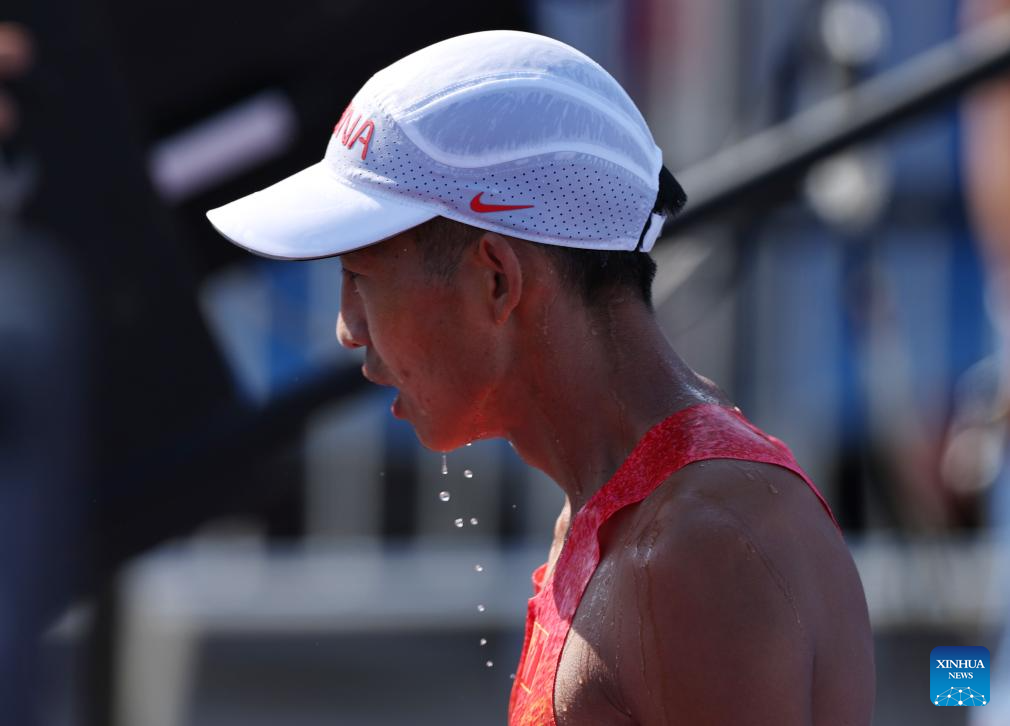 Wu Xiangdong of China is seen after the men's marathon of Athletics at the Paris 2024 Olympic Games in Paris, France, Aug. 10, 2024. (Xinhua/Li Jing)