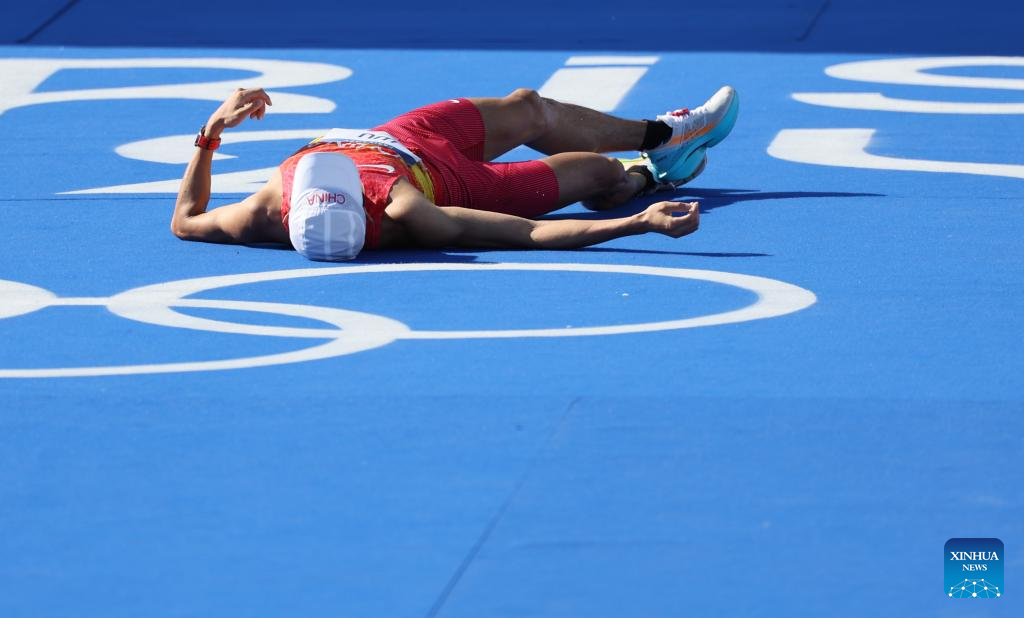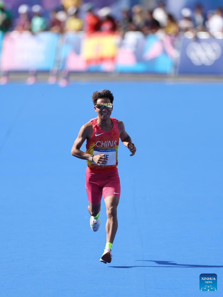 Wu Xiangdong (C) of China reacts after passing the finish line during the men's marathon of athletics at the Paris 2024 Olympic Games in Paris, France, Aug. 10, 2024. (Xinhua/Li Gang)