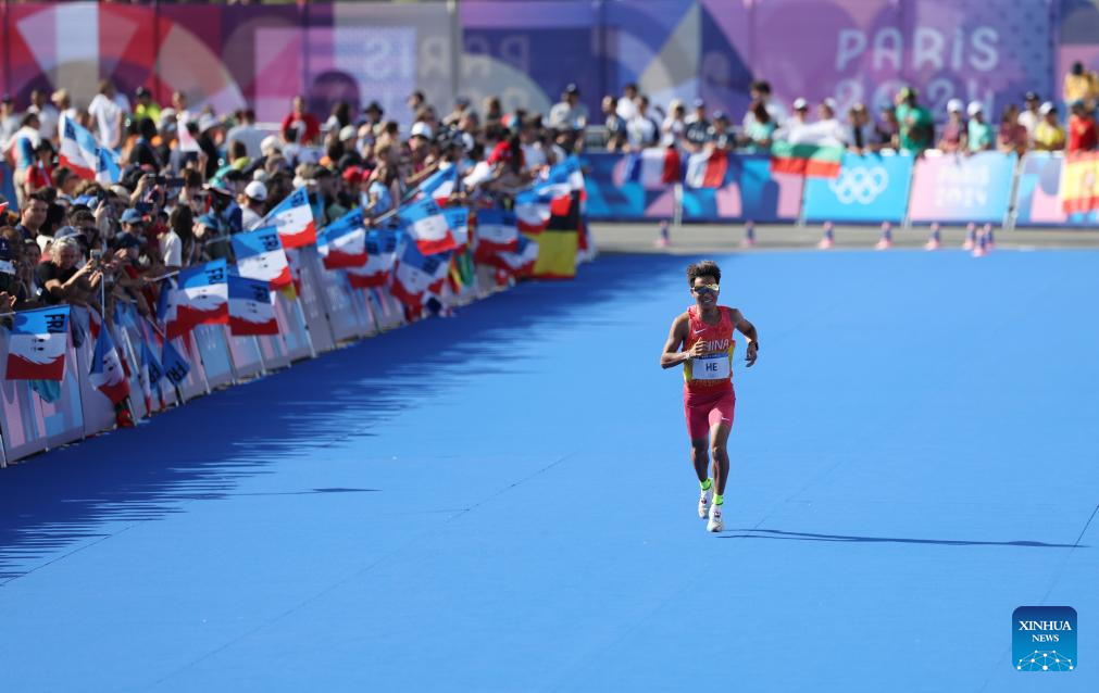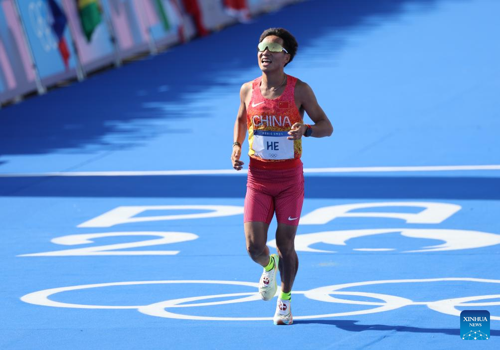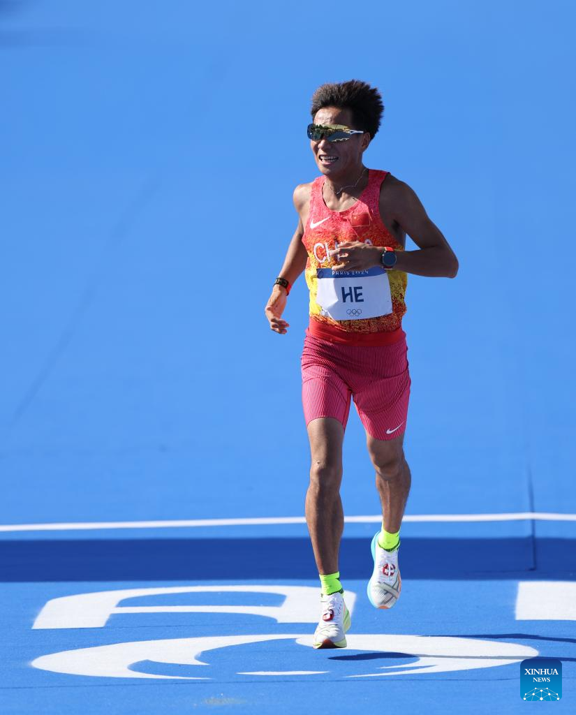 He Jie of China arrives at the finish line during the men's marathon of Athletics at the Paris 2024 Olympic Games in Paris, France, Aug. 10, 2024. (Xinhua/Li Jing)