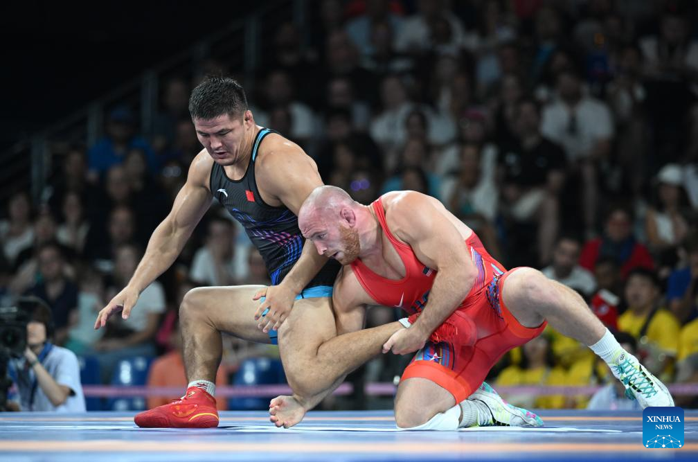 Kyle Frederick Snyder (R) of the United States competes against Awusayiman Habila of China during the men's freestyle 97kg 1/8 final of wrestling at the Paris 2024 Olympic Games in Paris, France, Aug. 10, 2024. (Xinhua/Wu Wei)
