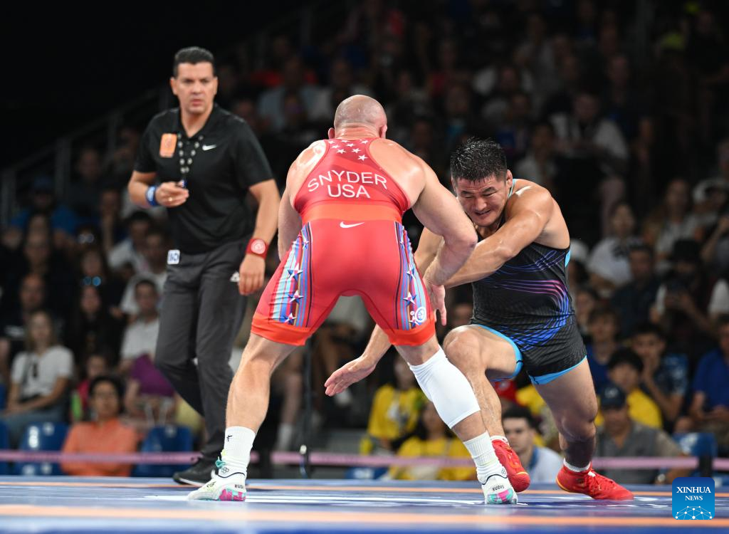 Kyle Frederick Snyder (C) of the United States competes against Awusayiman Habila of China during the men's freestyle 97kg 1/8 final of wrestling at the Paris 2024 Olympic Games in Paris, France, Aug. 10, 2024. (Xinhua/Wu Wei)