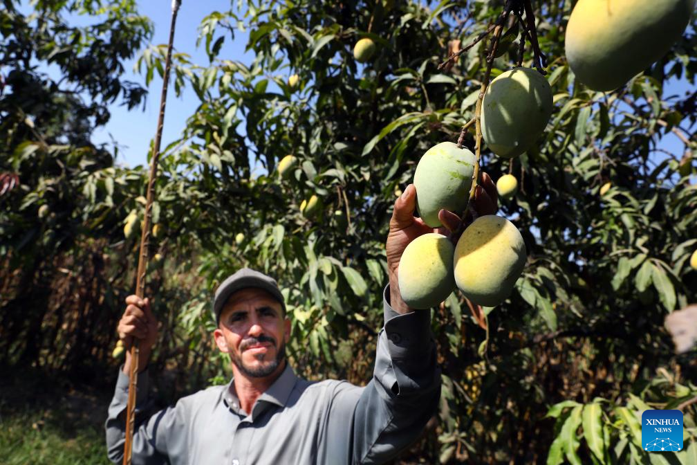 A farmer harvests mangoes at a farm in Ismailia Governorate, Egypt, Aug. 11, 2024. Mangoes have entered harvest season in Egypt. (Xinhua/Ahmed Gomaa)