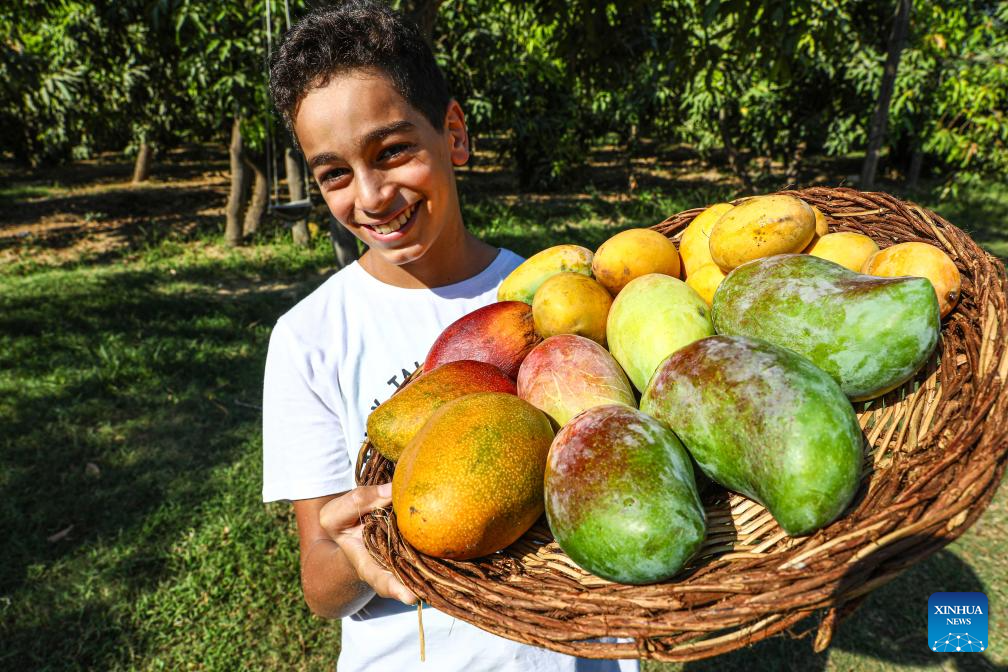 A boy presents newly harvested mangoes at a farm in Ismailia Governorate, Egypt, Aug. 11, 2024. Mangoes have entered harvest season in Egypt. (Xinhua/Ahmed Gomaa)