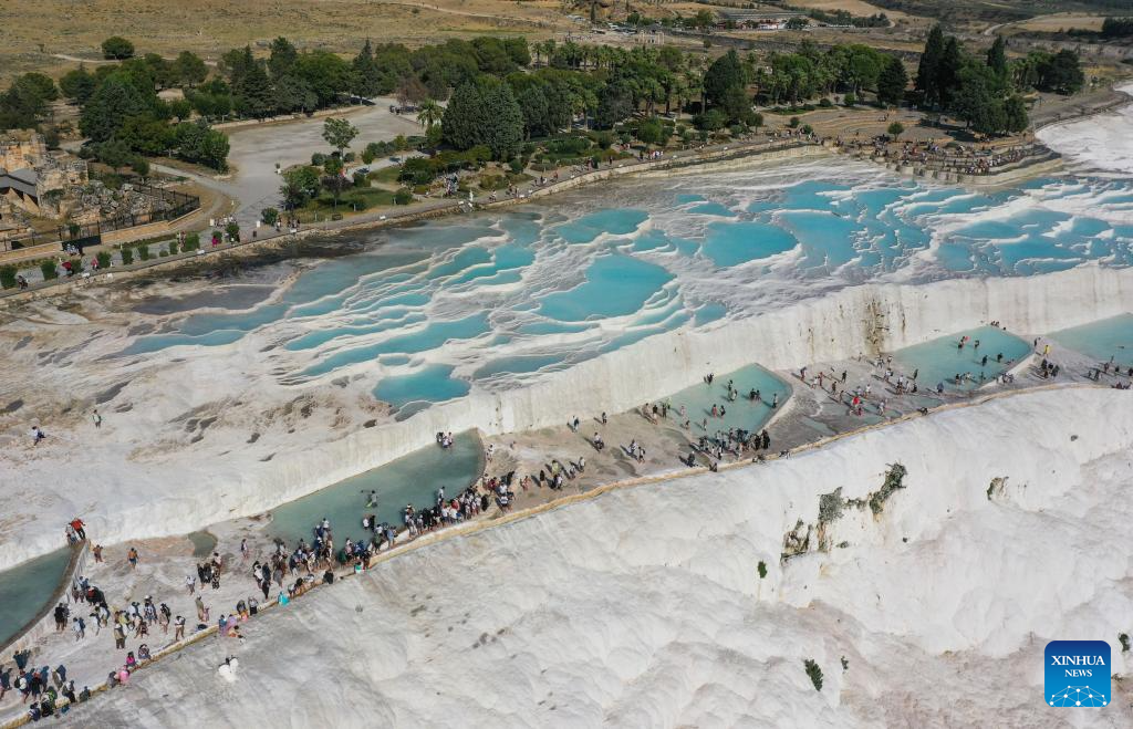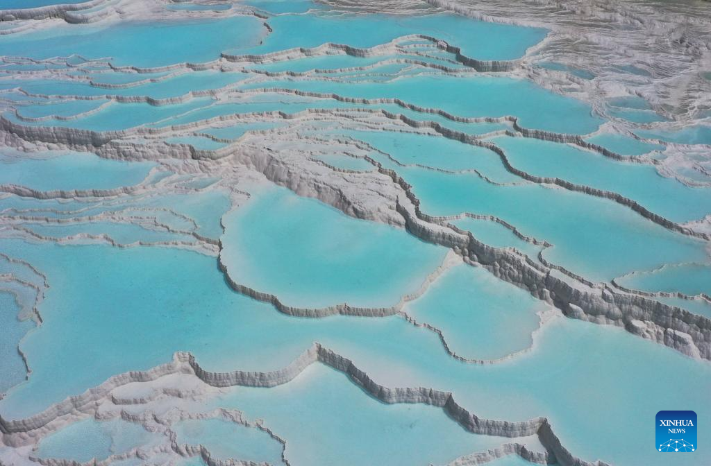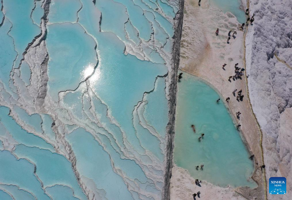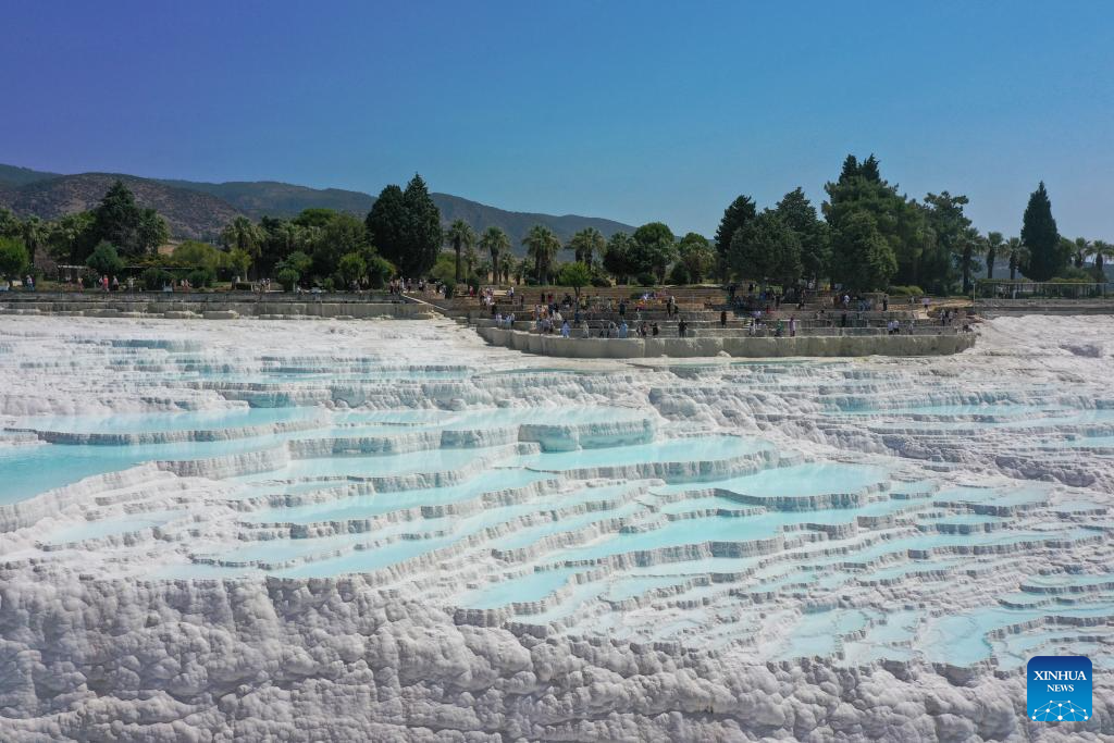 Pamukkale, or Cotton Castle, is a main Turkish tourist attraction known for its white travertine made up of natural calcified waterfalls and a series of terraced basins. (Xinhua/Liu Lei)