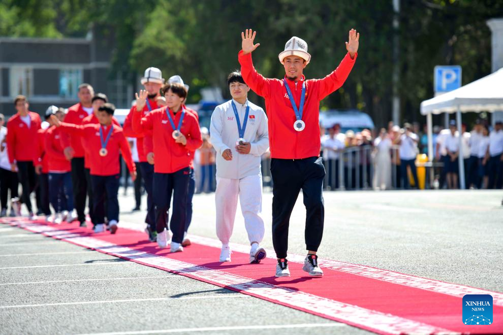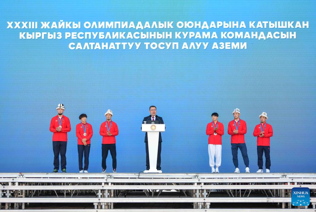 Athletes attend a ceremony of honoring members of the Kyrgyz Olympic team held in Bishkek, Kyrgyzstan, Aug. 13, 2024. Kyrgyz athletes won two silver and four bronze medals during the Paris 2024 Olympic Games. (Xinhua)