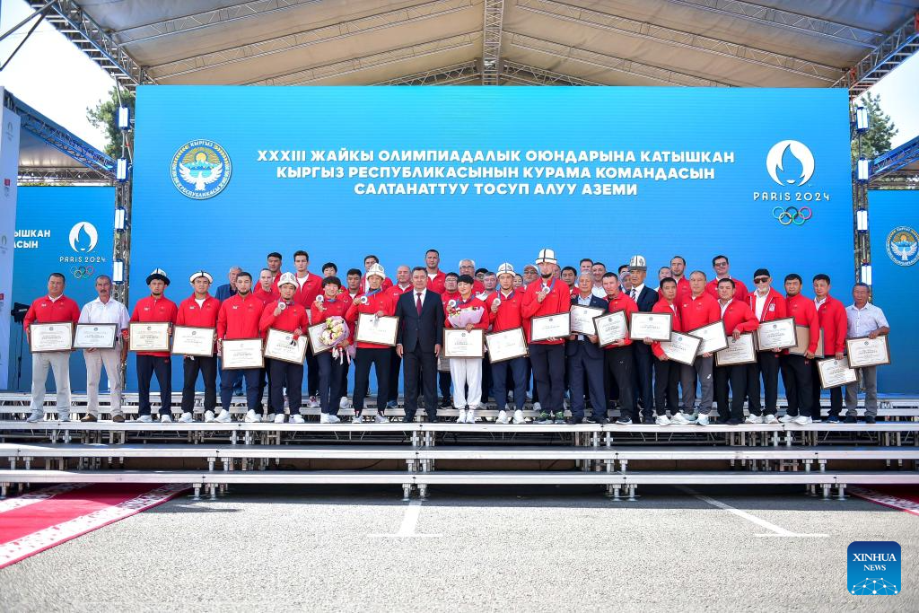 Kyrgyz President Sadyr Japarov (front C) poses with members of the Kyrgyz delegation during a ceremony of honoring members of the Kyrgyz Olympic team held in Bishkek, Kyrgyzstan, Aug. 13, 2024. Kyrgyz athletes won two silver and four bronze medals during the Paris 2024 Olympic Games. (Xinhua)