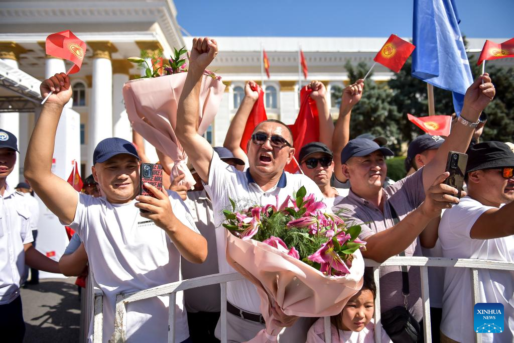 People cheer during a ceremony of honoring members of the Kyrgyz Olympic team held in Bishkek, Kyrgyzstan, Aug. 13, 2024. Kyrgyz athletes won two silver and four bronze medals during the Paris 2024 Olympic Games. (Xinhua)