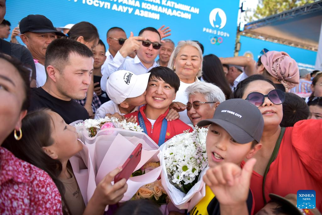 Meerim Zhumanazarova (C), silver medalist of women's freestyle 68kg of wrestling at the Paris 2024 Olympic Games, is surrounded by people during a ceremony of honoring members of the Kyrgyz Olympic team held in Bishkek, Kyrgyzstan, Aug. 13, 2024. Kyrgyz athletes won two silver and four bronze medals during the Paris 2024 Olympic Games. (Xinhua)