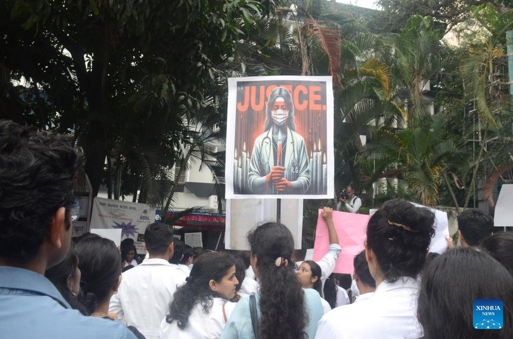 People participate in a protest over the rape and murder of a trainee doctor, in Bengaluru, India, Aug. 17, 2024. High court in India's eastern state of West Bengal Tuesday ordered that country's premier investigating agency, the Central Bureau of Investigation (CBI), should probe the rape and murder of a trainee doctor at a medical college and hospital in Kolkata, officials said. The decision from the court came amid widespread protests over the gruesome rape and murder of a 31-year-old doctor in Kolkata's RG Kar Medical College and Hospital earlier this month. (Xinhua)