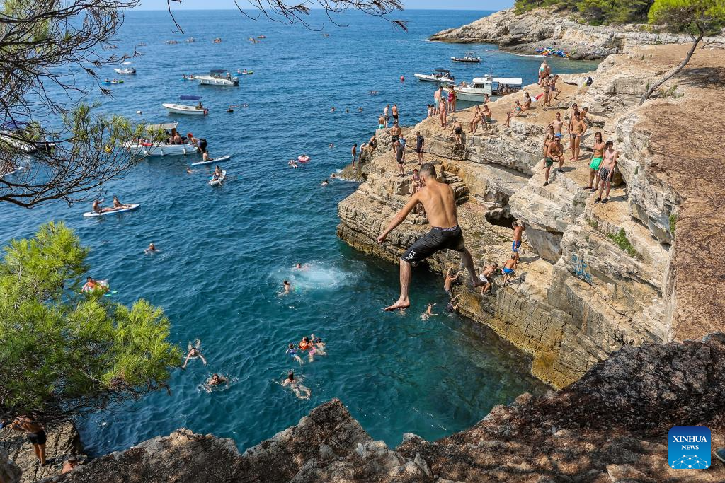 People dive into the sea to cool off from the cliff at the Seagull's Rocks Beach in Pula, Croatia on Aug. 14, 2024. The maximum temperature in Pula reaches 35 degrees Celsius during the day. (Srecko Niketic/PIXSELL via Xinhua)